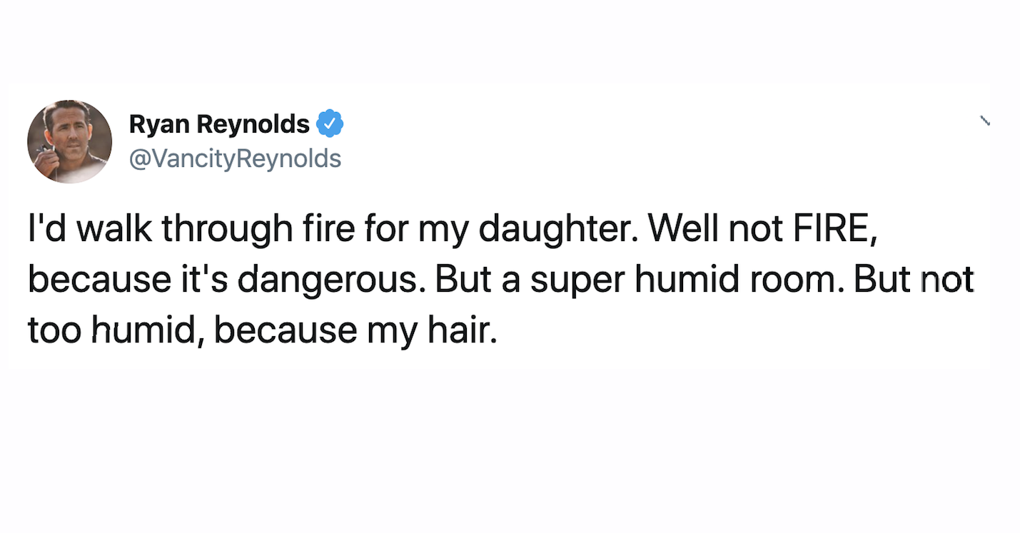 Weve seen Ryan Reynolds in all KINDS of diverse genres of movies like Deadpool Deadpool 2 and even The Green Lantern where he plays an entirely different superheroBut I had no idea he was also hilarious on Twitter which almost seems unfair to have so much talentHere are some funny Ryan Reynolds tweets from. 13Ryan Reynolds pens hilarious tweets about parenting his daughter from slating her garbage artwork to planning her tattoo. Lucky for me you clicked on this so youre just as screwed up as I am and your favorite celebrity dad on social media is Ryan Reynolds.